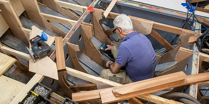 With the frames removed there were still sections of plywood biscuits still attached to the topside frames, so these were carefully chiselled off in order to protect the 76-year-old mahogany diag hull planking. The screws and nails were subsequently cut off and ground flat before the hull was sanded and cleaned for the new frames to be added.